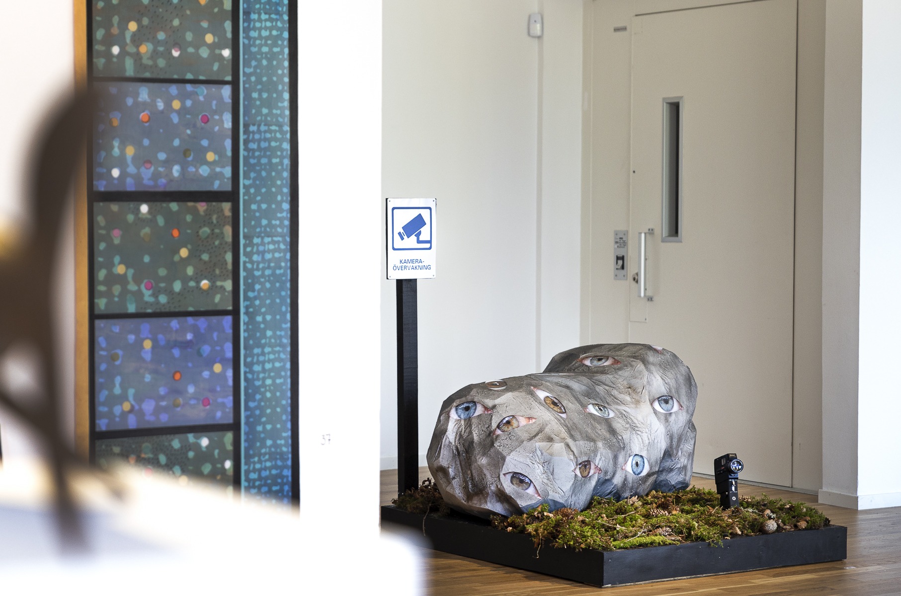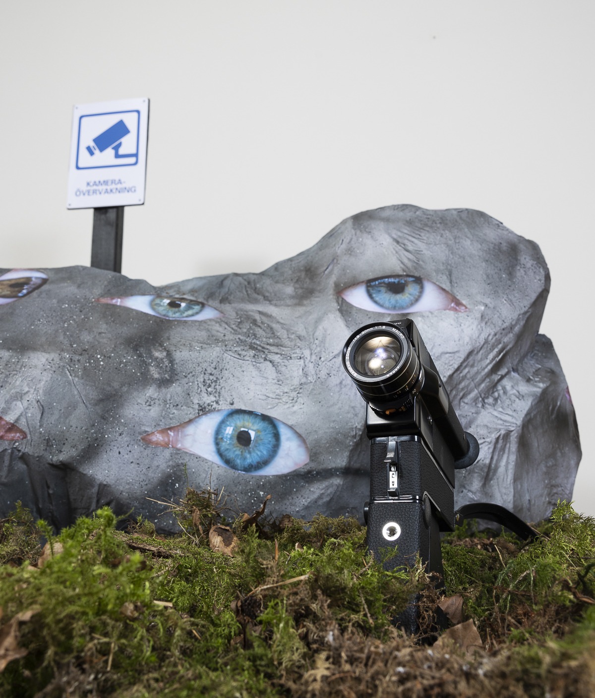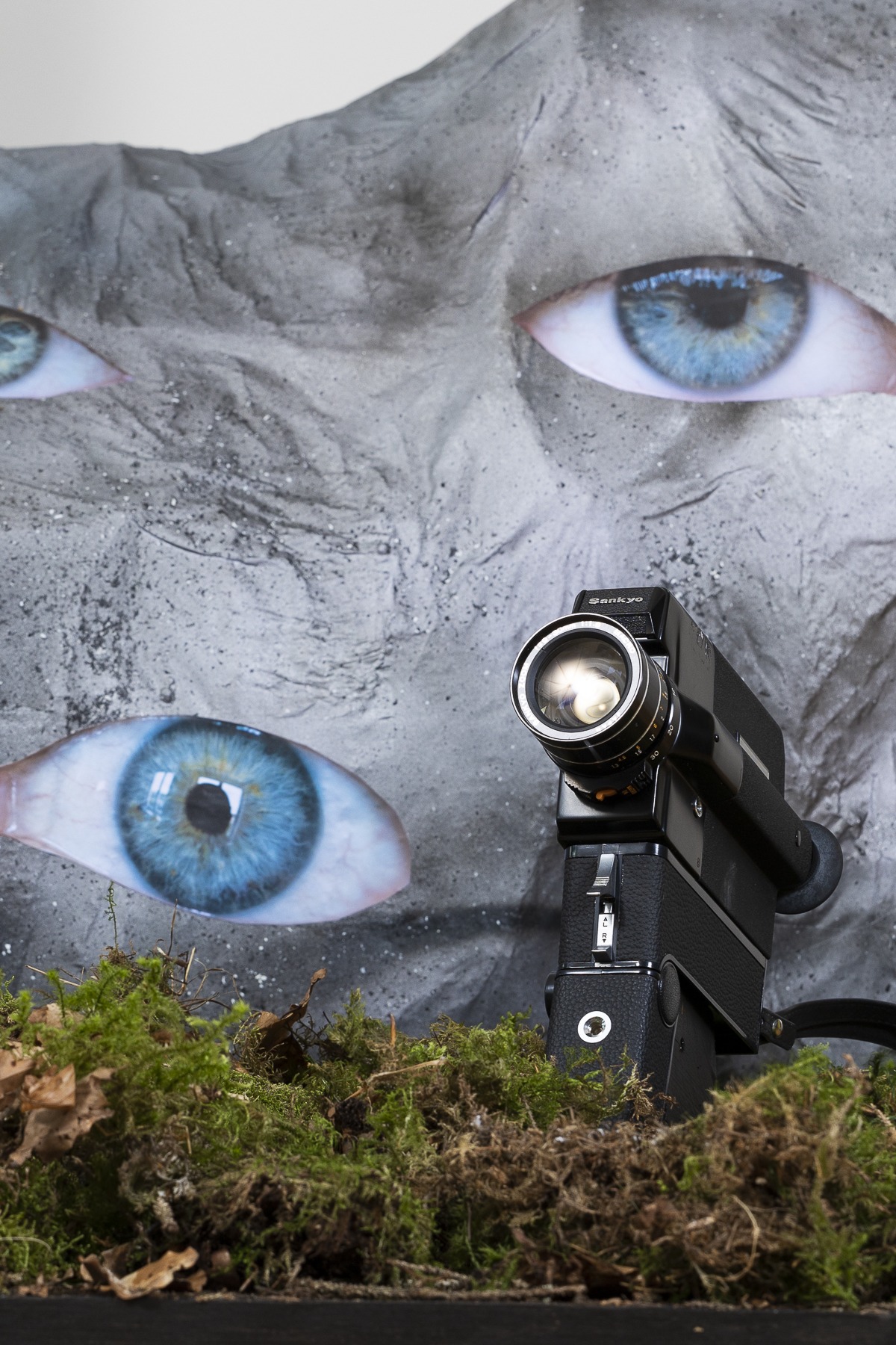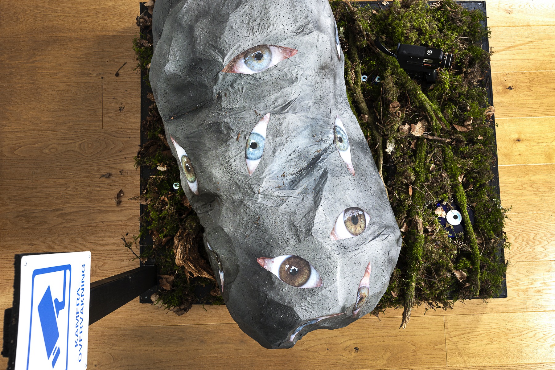 Fotografi, frigolit, glas (grekiska blå ögat), ready made produkter (skylt och filmkamera) , återvunnet trä samt mossa och grenar från skogen.